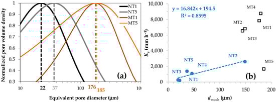 Normalized pore volume distributions and corresponding modal diameters (continuous and dotted lines, respectively) for the first (1) and last (5) sampling dates under no tillage, NT, and minimum tillage, MT (a), and a correlation between the saturated hydraulic conductivity (Ks) and modal pores diameter (dmode) for all sampling dates (b). Note that the Ks values refer to the medians obtained with Approach 5 (SSBI).