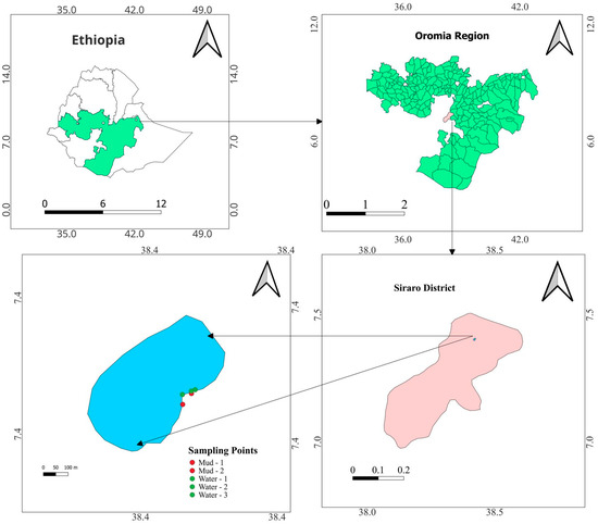 The sampling area map. The map in the upper left shows Ethiopia, while the upper right (green) shows the Oromia Regional State. The lower right (red) highlights Siraro District (Wereda), where Lake Chitu is located. The bottom left (blue) shows Lake Chitu.
