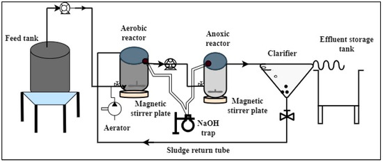 The treatment system consists of a feed tank, an aerobic reactor (2 L), an anoxic reactor (1 L), and a clarifier, all operated and sequentially connected using appropriate pipes (Figure 2). Both aerobic and anoxic reactors were continuously mixed using a magnetic stirring bar. In addition, the aerobic reactor was continuously aerated using an adjustable silent air pump (ACO-6603: Hailea Group Co., Ltd., Chaozhou, Guangdong, China). The system was operated at ambient temperature (20 to 25 °C) in the laboratory. To trap HCN, a 1 N NaOH alkaline mixture-filled flask was connected to the two reactors.