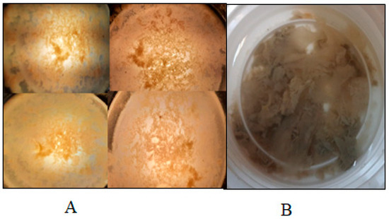 The biofilm formed during the consortia establishment process (A): biofilm formed on the wall of the reactor; (B): biofilm formed at the base of the reactor.