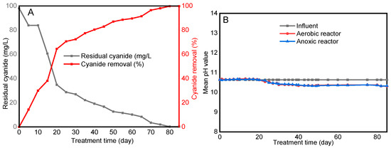 Cyanide degradation and pH of the solution during the consortia establishment period. The initial residual cyanide concentration in the solution was 97.93 mg/L. (A): Residual cyanide concentration along the treatment period and cyanide percent removal; (B): the pH of the solution in the influent, aerobic reactor, and anoxic reactor.