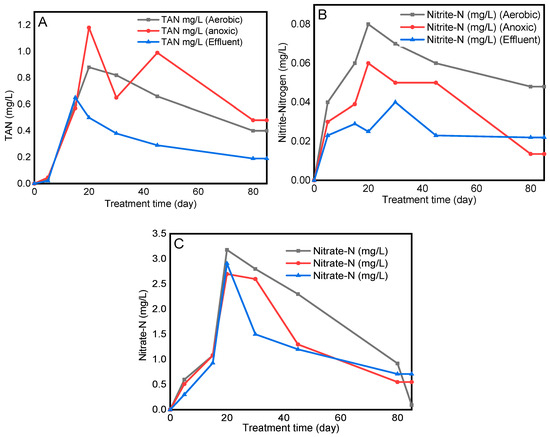 As TAN concentrations declined in the treatment days, the concentration of nitrite-N and nitrate-N also decreased (Figure 5B,C), indicating the presence of simultaneous nitrification and denitrification. Nitrite-N and nitrate-N levels were slightly higher in the aerobic reactor compared to the anoxic reactor. Nitrite-N concentrations throughout the operation ranged between 0.02 and 0.04 mg/L, and nitrate concentrations were between 0.71 and 12.6 mg/L.