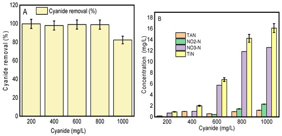 The cyanide and cyanide derivative removal potential of the consortia. (A): Cyanide percent removal of the consortia for 200 mg/L, 400 mg/L, 600 mg/L, 800 mg/L, and 1000 mg/L; (B): final effluent concentration of TAN, nitrite-N, and nitrate-N when the consortia were fed with 200 mg/L, 400 mg/L, 600 mg/L, 800 mg/L, and 1000 mg/L.