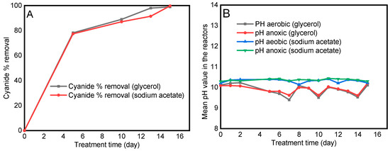 The cyanide degradation efficiency of the consortia was 99.74 ± 0.08% when sodium acetate was used as a carbon source and was not significantly affected when it was replaced by glycerol (Figure 7A). The only major difference noticed in the treatment process was pH fluctuation when glycerol was used as a carbon source (Figure 7B). When glycerol was used as a carbon source, the pH of the solution in the reactor was adjusted by sodium carbonate on days 7, 10, and 14 to control cyanide volatilization.