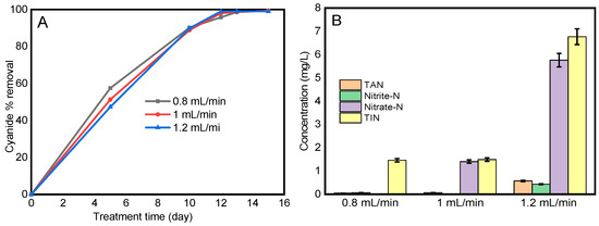 Percent removal of cyanide and the concentration of TAN, nitrite-N, nitrate-N, TAN, and TIN of the final effluent for different flow rates. (A): Percent removal of cyanide for the flow rates of 0.8 mL/min, 1 mL/min, and 1.2 mL/min; (B): the concentration of TAN, nitrite-N, nitrate-N, TAN, and TIN for 0.8 mL/min, 1 mL/min, and 1.2 mL/min.