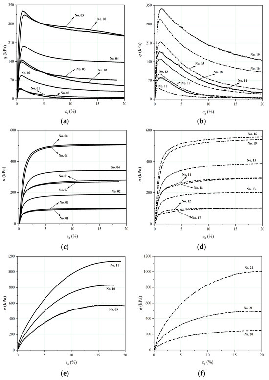 As can be seen from Figure 6a,b, the shapes of the undrained stress paths of both IOTs specimens are quite similar (C-shaped), indicating that contraction occurred at all of the stress levels. Severe strain-softening behavior and liquefaction behavior were observed in the loosest samples (Nos. 01 and 12) when they were sheared at 100 kPa, and q and p′ at the end of the tests were quite close to the origin of coordinates. Their stress paths tended to exhibit a small amount of inversion at the end of the tests (Figure 6c), which was probably due to the lateral restraint of the rubber membrane at axial strain of around 20%. Carrera et al. [5] determined that true liquefaction occurred in Stava tailings when the confining stresses were equal to the pore pressures, which approaches to the definitions reported by different researchers [48,49]. Similar patterns of liquefaction behavior were also observed by Li and Coop [27] for the loosest IOTs from the upper beach when sheared at 50 kPa.