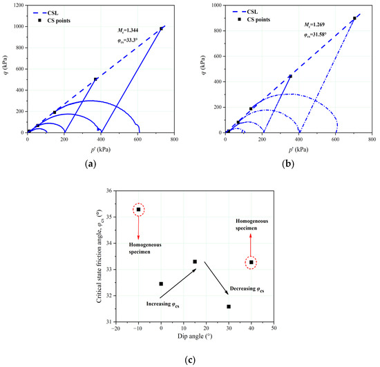 Stress paths and critical state lines for the IOTs containing a fine-grained interlayer with two different dip angles in the q-p′ plane: (a) all tests for the FGLA-15, (b) all tests for the FGLA-30, and (c) evolution of critical state friction angle (φcs) with dip angle.