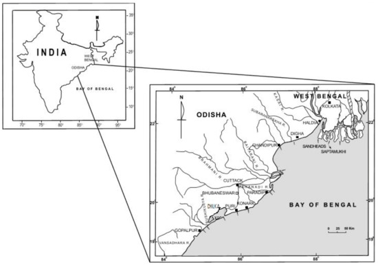 The coastal stretch of Odisha and West Bengal spans approximately 650 km, constituting about 10% of India’s total coastline. Surface waters are particularly susceptible to pollution due to their accessibility for waste disposal. The quality of surface water in an area is influenced by a combination of natural processes like precipitation inputs, weathering of rocks, and erosion, as well as anthropogenic activities, including urban development, industrial operations, and agricultural practices. Additionally, the growing demand for water resources contributes to these influences [24].