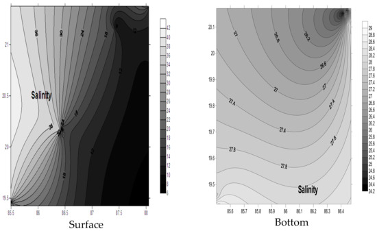 The salinity of coastal water ranged from 7.71 to 31.87 PSU in surface water and from 17.56 to 32.14 PSU in bottom water. The highest salinity levels were observed during the pre-monsoon season, likely due to the reduction in freshwater influx after the monsoon and during the summer months. Conversely, lower salinity values observed in October and November can be attributed to the dilution of coastal waters by freshwater discharges from rivers during the monsoon season. Rivers such as the Ganga and Hoogly play a significant role in reducing salinity levels in the northern Bay of Bengal during this period [31]. This study’s findings are consistent with the general trend of decreasing salinity during the monsoon, followed by a gradual increase in salinity levels from the north (Sandheads) to the south (Puri) along the coast (Figure 2). This pattern has also been observed in previous studies, reflecting the influence of riverine discharge on coastal water salinity [32].