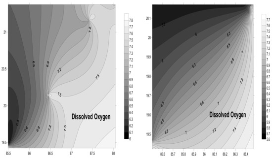 Contours showing variation in dissolved oxygen in mg/L unit by SURFER Analysis method.