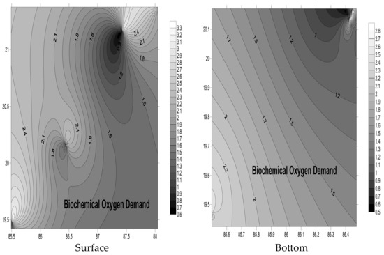 Contours showing variation in BOD in mg/L by SURFER Analysis.