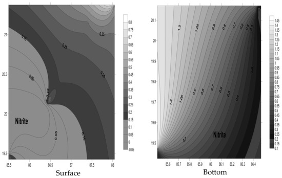Nitrite is the partial form of nitrogen occurring as an intermediate form during denitrification and nitrification reactions. Nitrite in water is formed through the oxidation of ammonia by aerobic nitrifying bacteria such as Nitromonas or the reduction of nitrate by facultative anaerobic denitrifying bacteria like Pseudomonas. This process renders nitrite a highly unstable dissolved inorganic nitrogen species found in seawater. No significant variation in nitrite concentration was noticed in the transects of West Bengal, as the waters are well mixed due to the relatively shallow depth (5.5 m–11.0 m).