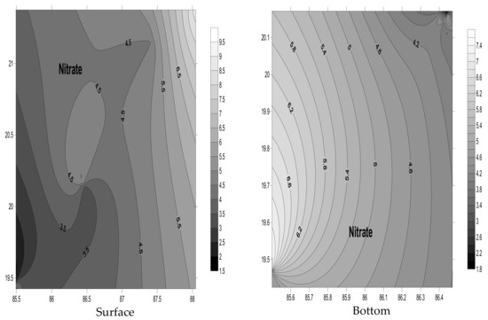 Contours showing variation in nitrate in µmol/L unit by SURFER Analysis method.
