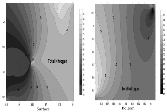 Contours showing variation in total nitrogenin µmol/L unit by SURFER Analysis method.