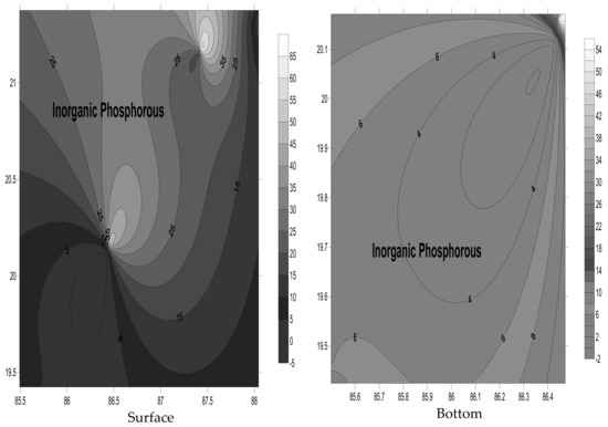 Total phosphorous concentration ranged from 3.75 to 121.87 μmol/L for the surface water and from 9.45 to 66.14 μmol/L for the bottom water. The lower nutrient values on the surface were due to utilization by phytoplankton. The observed variation might be caused by river water draining into the Bay of Bengal with a timely increase in concentration of nutrients (Figure 10).