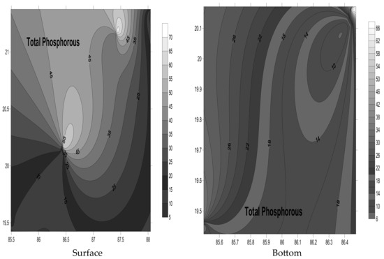 Contours showing variation in total phosphorous in µmol/L unit by SURFER Analysis method.
