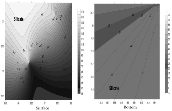 Contours showing variation in silicate in µmol/L unit by SURFER Analysis method.