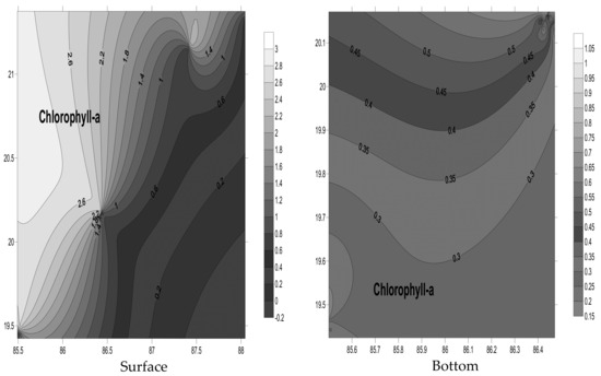 The Chlorophyll-a concentration ranged from 0.38 to 8.84 mg/L in surface water and from 0.17 to 1.96 mg/L in bottom water (Figure 12). The highest concentration of Chlorophyll-a was recorded in February at the Puri shore station, likely due to higher nutrient levels. The concentration of surface Chlorophyll-a was higher compared to the bottom across all stations in coastal waters. Chlorophyll-a showed a moderate positive correlation with ammonia (r = 0.512), inorganic phosphate (r = 0.213), total phosphate (r = 0.450), and silicate, and a weak negative correlation with water temperature (r = −0.255) [42] (Figure 12 and Table 3). This indicates that chlorophyll-a levels are influenced by these nutrient parameters.