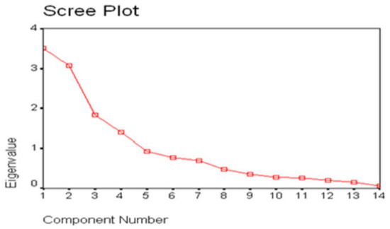 Principal Component Analysis (PCA) is a mathematical technique that identifies and extracts linear relationships among variables, helping to understand inter-parameter relationships and explain correlation structures in detail [44,45], effectively summarizing the data while minimizing the loss of original information [42,46]. PCA transforms potentially correlated variables into a smaller set of uncorrelated variables, referred to as principal components. The first principal component captures as much variability in the data as possible, with subsequent components accounting for the remaining variability. In this study, PCA was conducted using SPSS-10.0, considering all parameters to explore direct relationships and sources of environmental variables in the coastal area. The Scree plot in Figure 13 displays the eigenvalues for each component, guiding the selection of components. Factor analyses with varimax rotation were applied, selecting eigenvalues greater than 1. Results were organized to include only those with values exceeding 0.4 [32,47].
