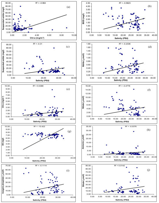 Linear regression analysis: (a) Suspended solids and Chl-a; (b) BOD and Salinity; (c) Suspended solids and Salinity; (d) Nitrite and Salinity; (e) Chl-a and Salinity; (f) Nitrate and Salinity; (g) DO and Salinity; (h) Ammonia and Salinity; (i) Inorganic Phosphate and Salinity; (j) Silicate and Salinity.