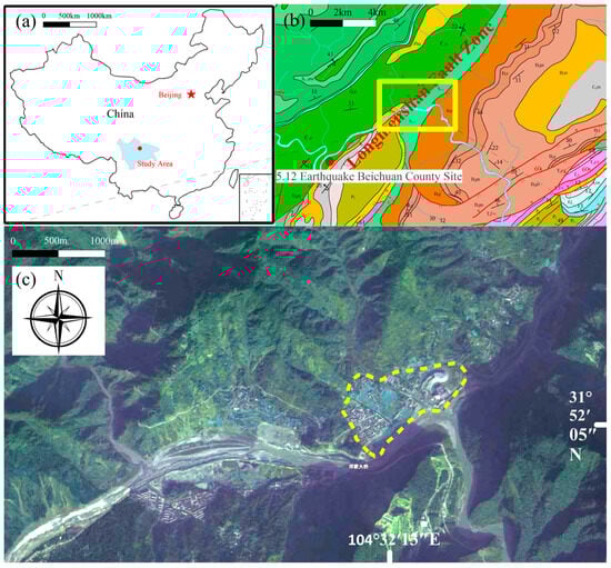 The study area is situated in Huangjiaba Village, Beichuan County, Mianyang City, Sichuan Province, southwestern China (as shown in Figure 1a). It is positioned within the Longmen Shan fold-thrust belt along the eastern edge of the Qinghai–Tibet Plateau. The main exposed strata consist of the Cambrian Jiangjiagou Formation, Modao Formation, Silurian Xintan Group, Luoreping Group, as well as the Devonian and Permian formations. The lithologies comprise Cambrian sandstone and siltstone, Silurian sandy shale interbedded with sandstone, Permian carbonaceous shale and limestone, and Devonian alternating layers of limestone and sandstone (as shown in Figure 1b).
