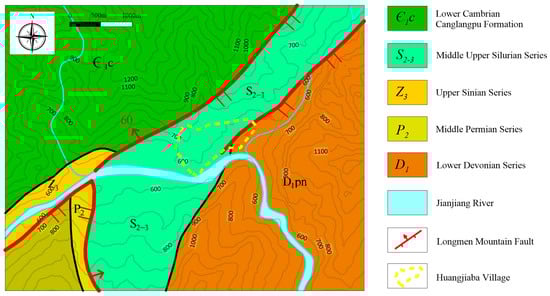 Beichuan Qiang Autonomous County was among the areas most severely impacted by the catastrophic ‘5.12’ Wenchuan earthquake in 2008 [,,]. Historically, this region has been highly susceptible to frequent geological hazards, including landslides and debris flows, classifying it as a high-risk area for multiple disaster types [,]. The primary fault in the study area is the Yingxiu–Beichuan fault, the central fault of the Longmen Shan fault system (as shown in Figure 2). This fault divides Precambrian metamorphic complexes and Silurian–Devonian strata on one side, which are thrust over Upper Paleozoic–Triassic strata on the other. This thrusting and overthrusting have caused significant stress accumulation along the contact zones, rendering the region particularly susceptible to earthquakes and other geological hazards [,]. The northern segment of the Longmen Shan overthrust zone forms a narrow, northeast–southwest trending belt that extends across Beichuan, Jiangyou, and Guangyuan. The area is distinguished by well-developed faults that form narrow, elongated zones, primarily composed of brittle carbonates and clastic rocks. These faults are predominantly compressive, high-angle reverse faults arranged in an imbricate pattern, with dips typically exceeding 50° and oriented northwestward. Structural fractures in the study area are relatively well developed, with fracture densities typically ranging from 0.5% to 10%, and locally reaching 10% to 20% or higher []. Longitudinal tension fractures are often well developed in the cores of folds, with their development diminishing or weakening from top to bottom. These fractures are intermittently layered, facilitating groundwater migration.