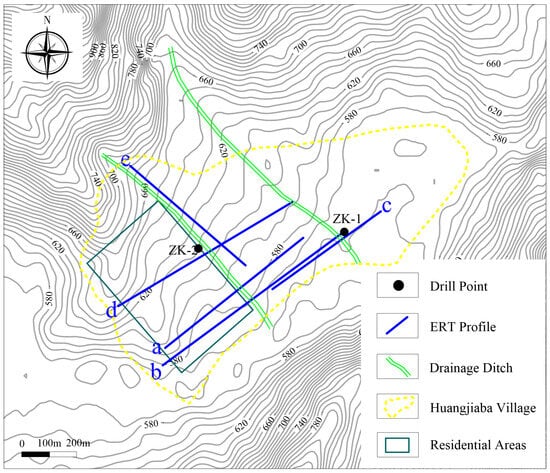 The profiles were used to map subsurface undulations, locate aquiferous layers, determine the depth of the water table in Huangjiaba Village, and identify optimal water storage zones. These profiles were oriented southwest to northeast (as shown in Figure 3), with profiles “a” and “c” each measuring 500 m in length, and profile “b” measuring 760 m.