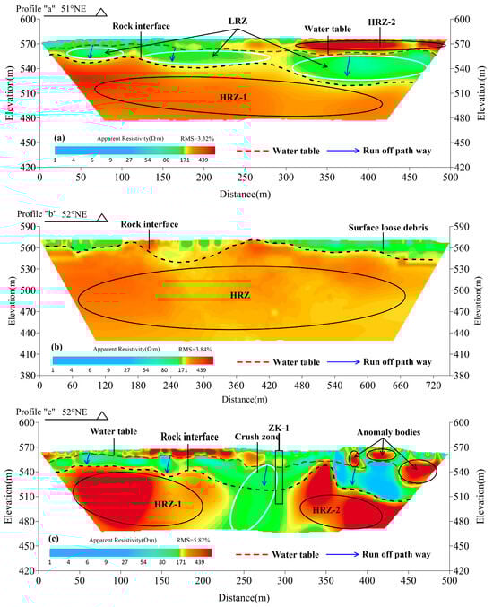ERT profiles named “a”, line “b”, line “c”. HRZ: high-resistivity zone; LRZ: low-resistivity zone. (a) Inversion result of profile “a” (b) Inversion result of profile “b” (c) Inversion result of profile “c”.