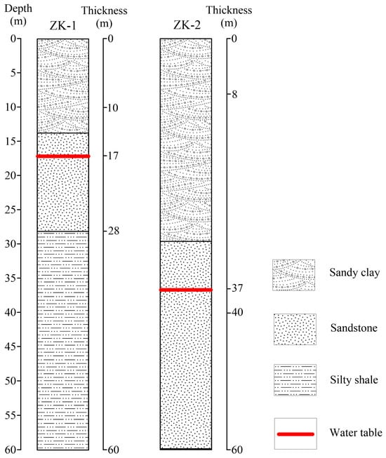 As shown in Figure 4c, the starting point of profile “c” is positioned at the 500 m mark of profile “b”, and the resistivity inversion results in the overlapping sections of the two lines align closely. The lithology and stratification on profile “c” are consistent with those observed on profile “a”. According to borehole ZK-1 (as shown in Figure 5), the surface layer at ZK-1 consists of 14 m of sandy clay, with groundwater encountered at 17 m. The sandstone layer extends from 14 to 28 m, and the sandy shale layer from 28 to 60 m. We used core samples and water-bearing depths from boreholes to identify the lithology of aquifers and confining layers in the study area. By incorporating borehole information into the corresponding ERT profiles, we found that the aquifer lithology consists of sandstone, while the confining layer is composed of sandy shale. The resistivity of sandstone was observed to be lower than that of sandy shale. Based on the borehole information, the interpretation of the profiles indicates a surface layer of unevenly thick sandy clay, followed by a sandstone layer with a bottom interface at an elevation of 540 m, underlain by sandy shale, which contains a developed fracture zone.