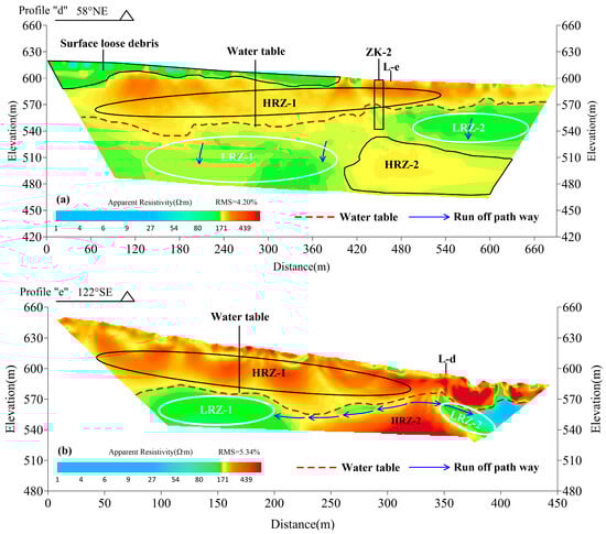 ERT profiles named “d”, line “e”. HRZ: high-resistivity zone; LRZ: low-resistivity zone; L-d: line “d”, L-e: line “e”. (a) Inversion result of profile “d” (b) Inversion result of profile “e”.