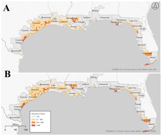Gulf of Mexico Study Area NFIP insurance claims. (A) Total count per census tract between 2010 and 2014 and (B) total count per census tract between 2015 and 2019.
