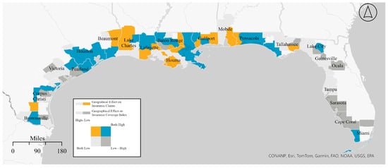 Figure 4 depicts a bivariate map comparing these results for our Gulf-wide models. Significant positive CZ-county level effects for the insurance coverage index model suggest areas of relatively high insurance coverage, and areas positive CZ-county level effects in the exposure (NFIP claims) model suggest areas with significant flood exposure. High-low counties on the map may have relatively less insurance coverage based on their exposure patterns in our study period.