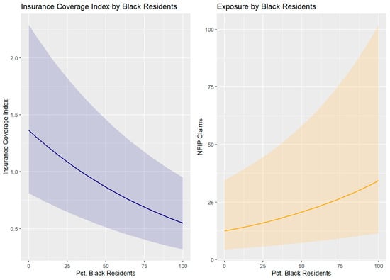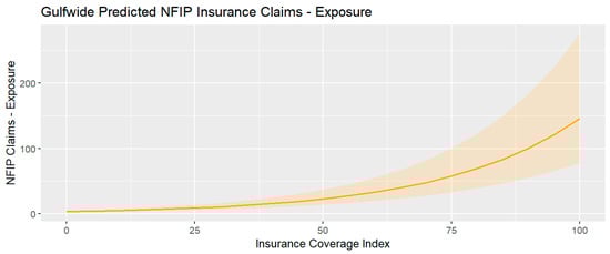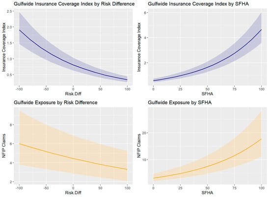 The percentage of structures in a flood hazard area in a tract shows a positive relationship to estimated insurance coverage index the coverage for both models, Gulf-wide (1.83 CI [1.79–1.87]) and exposed (1.79 CI [1.71–1.88]). For both models, this suggests that tracts in a shoreline county where 23% of the structures lay in a flood zone are predicted to have an insurance coverage index of 2.90%; this is estimated to be 2.86% lower than tracts with 50% of the structures in an SFHA.