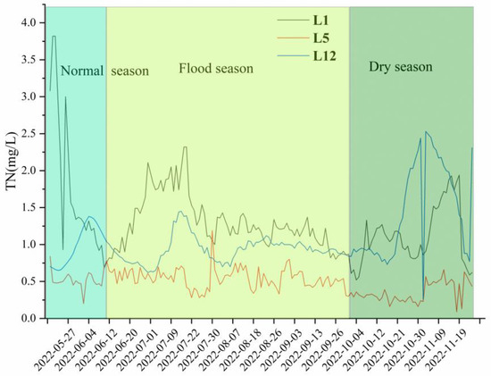 Regarding the influent rivers, they are spatially clustered into three categories. Overall, the average TN concentration at the first category of sites (3.27 mg/L) is higher than that at the second category (1.89 mg/L) and the third category (0.622 mg/L). The first category includes sites R2 (Cao River), R3 (Bao River), and R7 (Tang River), which are significantly affected by rainfall runoff and thus have higher nitrogen concentrations compared to other river sites. The second category includes sites R5 (Baigouyin River) and R4 (Xiaoyi River), where nitrogen concentrations decrease during the flood season due to the dilution effect of rainfall. The third category consists of sites R1 (Fu River) and R6 (Yellow River Diversion inlet). Site R1 has lower nitrogen concentrations due to the combined effects of upstream ecological wetland purification and rainfall dilution. Site R6, connected to the Xiaobai River as part of the Yellow River Diversion Project inlet, has better water quality.