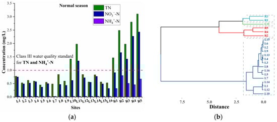 Spatial variation (a) and cluster analysis (b) of nitrogen in the Baiyangdian Lake during the normal season.