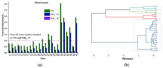 Spatial variation (a) and cluster analysis (b) of nitrogen in the Baiyangdian Lake during the flood period.