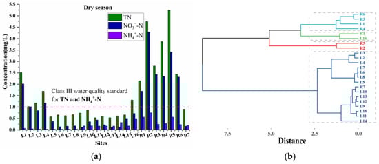 As shown in Figure 5, during the dry season, the sites within Baiyangdian Lake are also clustered into three categories: The first category includes sites that are close to the Cao River (R2) and Baigouyin River (R5), such as sites L1–L4 and L16. Sites L1 and L16, with high nitrogen concentrations (exceeding 2.0 mg/L), are clustered with the influent rivers. These two rivers have been contaminated during the dry season (with TN concentrations reaching up to 4.75 mg/L and 5.25 mg/L), significantly impacting the surrounding water bodies. The second category consists of sites located downstream of the first category, influenced by the lake’s self-purification capacity, resulting in a decrease in nitrogen concentrations. Representative sites include L5–L8. The third category comprises sites in the southern part of the lake, L9–L15, where human activities such as tourism and aquaculture are minimal or absent during the dry season (ice cover period), leading to relatively lower nitrogen concentrations in the water body.