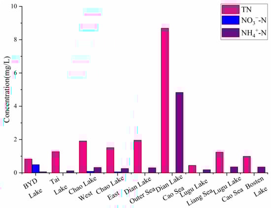 Baiyangdian Lake, the largest shallow lake in the North China Plain, is known as the “Pearl of North China”. The quality of its water directly affects the ecological safety of the Xiong’an New Area and also impacts the regional ecological balance and biodiversity of the Beijing–Tianjin–Hebei urban agglomeration [19]. In recent years, national and local governments have carried out comprehensive management of Baiyangdian Lake and its tributaries, and ecological water replenishment measures, such as the Yellow River Diversion Project, have been implemented, leading to continuous improvement in the water quality of Baiyangdian Lake. In this study, we compared the nitrogen levels in Baiyangdian Lake with those in other lakes, including Tai Lake [20], Chao Lake [21], Dian Lake [22], Lugu Lake [23], and Bosten Lake [24] (Figure 6).