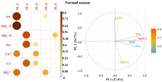 PCA is a well-established multivariate statistical analysis method that incorporates multidimensional factors into a unified system for quantitative research. In this study, PCA is employed to identify the main pollution sources of nitrogen in the Baiyangdian Lake. The analysis was based on seven selected water quality parameters, namely, TN, NO3−-N, NH4+-N, Na+, Ca2+, SO42−, and Cl−. Prior to the application of the data to the PCA model, the study data underwent the Kaiser–Meyer–Olkin (KMO) test and Bartlett’s test of sphericity. The results indicated that for the normal, flood, and dry seasons, the KMO values were 0.576, 0.656, and 0.565, respectively, and the Bartlett’s test values were 38.4 (p < 0.01), 123.5 (p < 0.001), and 63.8 (p < 0.001), respectively. These findings suggest that the water chemistry data of Baiyangdian Lake for the three hydrological periods meet the requirements for PCA. Based on an eigenvalue >1, two principal components were identified for each of the three hydrological periods, which accounted for 64.1%, 80.6%, and 67.5% of the total variance in the data, respectively.