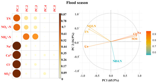 During the flood season, the first principal component (PC1) accounted for 65.5% of the total variance (Figure 9), with strong positive correlations observed with Na+, SO42−, and Cl−, and strong negative correlations with TN, NO3−-N, and Ca2+. As previously mentioned, Na+ and Cl− in Baiyangdian Lake primarily originate from domestic sewage, while TN and NO3−-N mainly come from manure and fertilizers. Therefore, PC1 represents the influence of domestic sewage, manure, and fertilizer on the Baiyangdian Lake. The second principal component (PC2) showed a strong positive correlation with NH4+-N. However, during the flood season, the concentration of NH4+-N in Baiyangdian Lake is relatively low, close to the detection limit, indicating significant nitrification occurring in the water body. Thus, PC2 represents the impact of nitrification on the nitrogen in Baiyangdian Lake.