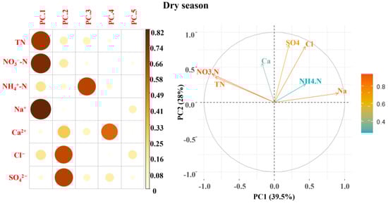 During the dry season (ice cover period), the first principal component (PC1) accounted for 39.5% of the total variance (Figure 10). There was a strong positive correlation with Na+, a strong negative correlation with TN and NO3−-N, and a moderate positive correlation with NH4+-N and Cl−. This suggests that the Baiyangdian Lake was influenced by domestic sewage. Furthermore, the negative correlation between NH4+-N and both TN and NO3−-N indicates that nitrification and denitrification processes were occurring in the water body. The second principal component (PC2) showed a strong positive correlation with SO42− and Cl−, and a moderate positive correlation with Ca2+, TN, and NO3−-N, indicating that PC2 represents the influence of manure and fertilizer on the Baiyangdian Lake.