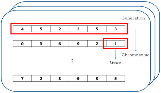 A genetic algorithm is a computational model designed to address problems by mimicking the principles of sexual reproduction and evolution found in nature [21]. The model boasts several strengths: it effectively explores solutions across a broad range and can be applied to high-dimensional problems with diverse variables [22]. These advantages have led to its widespread application in scheduling, allocation, control, and system identification [23]. The process of problem-solving using this model encompasses essential elements such as individuals, generations, fitness, and crossover. Figure 2 illustrates a schematic diagram depicting these fundamental components of a genetic algorithm.