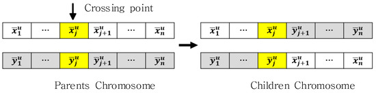 If the crossing point is randomly selected within parental chromosomes, the -th element is determined by Equation (2), and subsequent elements are exchanged according to the simple crossover method to ensure continuity.