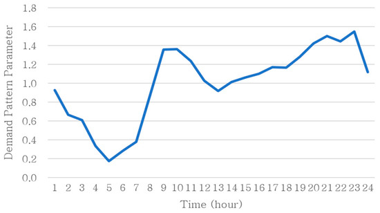 Baseline data for comparative hydraulic analysis were initially gathered using a multisensor monitoring platform for water distribution networks provided by the Office of Waterworks, Incheon City. Analysis of flow data from measuring stations in the target area revealed August 2023 as the month with the highest water supply. Consequently, hourly flow data from August 1 to 30 were compiled to create the initial pattern for the target area. Daily demand patterns were then derived by averaging collected data for each hour. Figure 5 illustrates the graph depicting the initial demand patterns of the target area.