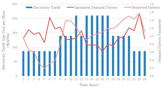 The convergence value of the optimization model was approximately 5000, with convergence occurring at the 30th generation out of a total of 50 generations. The calculated value of the objective function exhibited a phenomenon where the difference between the maximum and minimum values gradually decreased during the process of converging to the optimal solution. Figure 8 presents the graph comparing the derived demand patterns, as the optimal solution of the objective function, with the hourly electricity tariff.