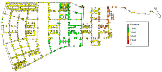 The maximum pressure formed is found at 16:00, when the supply is minimum in the optimized demand pattern, and the average value of the pressure head is 60 m. The maximum value of the pressure head is 65 m. Compared to the distribution of pressure head at the time zone of maximum pressure formation in the existing network, the average value decreased by approximately 4 m, and the maximum value decreased by around 1 m. Furthermore, it was assumed to satisfy the maximum hydrodynamic pressure (700 kPa) suggested in a water supply design standard.