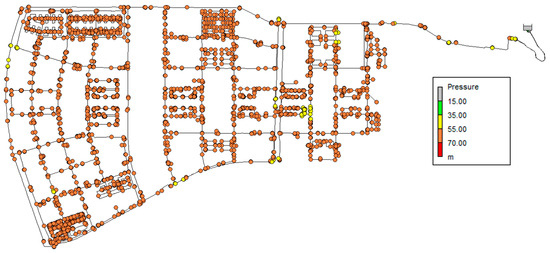 The water supply stability within a specific network depends on whether the pressure at nodes is appropriately maintained. To evaluate the stability in the target area, we applied the optimized demand patterns shown in Figure 8 to the EPANET network and analyzed the distribution of pressure heads in the entire network during the vulnerable hours when the pressure head has a minimum and a maximum value, as well as the pressure head results per time at the main nodes where the demand is high. Figure 9 illustrates the pressure head distribution at the time band when the minimum pressure is formed in the network with the optimized demand pattern on EPANET.