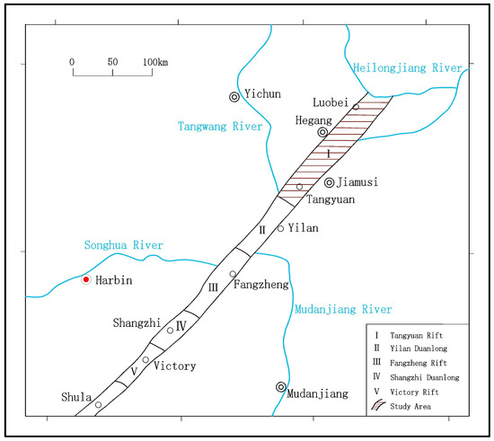 The Tangyuan fault depression represents a first-order tectonic unit located at the northernmost end of the Tan-Lu fault system. This geographical feature spans the regions of Hegang City, Tangyuan County, Luobei County, and Huachuan County in Heilongjiang Province, encompassing an area of approximately 3320 square kilometers, with a width ranging from 5 to 20 km as shown in Figure 1. The boundaries of this fault depression are primarily controlled by two deep-seated, large-scale faults that extend roughly parallel in a northeast (NE) direction, resulting in a long, narrow fault-depression basin aligned with this orientation.