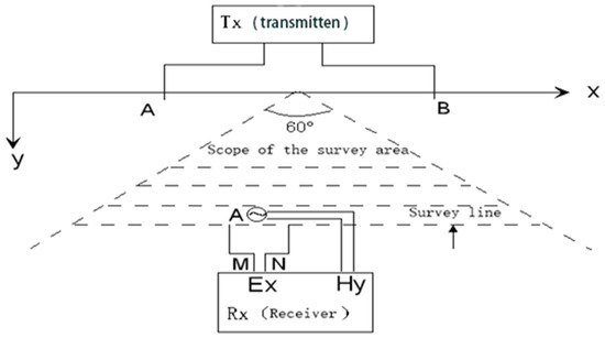 The Controlled-Source Audio-Frequency Magnetotelluric (CSAMT) method is an electromagnetic sounding technique that employs a finite-length grounded dipole as the field source. Simultaneous observations of electrical and magnetic field parameters are taken at specified distances from the dipole center. In this research, an equatorial dipole device is utilized for scalar measurements. Specifically, the horizontal component of the electric field (Ex), parallel to the field source, and the horizontal component of the magnetic field (Hy), orthogonal to the field source, are recorded (refer to Figure 2 for the layout of the equatorial dipole measurement device in the CSAMT method).