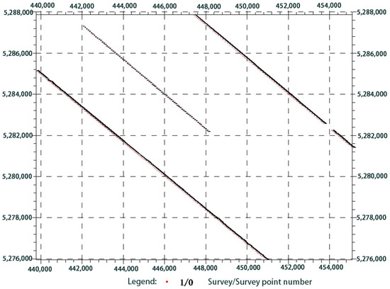 Line 2: With a total length of 10 km, this line extended 5.5 km within the survey area. It also utilized a point spacing of 50 m, yielding 200 measurement points, of which 110 were within the designated survey area.